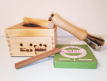 枡温灸はヒノキで作られた枡の中にもぐさを入れて行うお灸でお腹や腰にのせて柔らかな熱刺激が広範囲に伝わります。