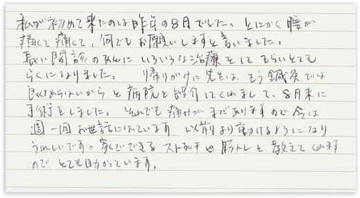 少しでも楽になればと鍼灸をためすことにしました。初めはベットに上がる事も困難でしたが、徐々にうつ伏せで治療が受けられるようになりました。