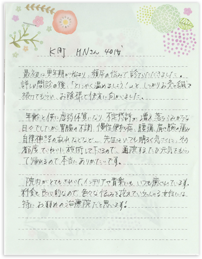 私は友人から女性の鍼灸師さんで安心できると聞き、家から遠いのですが三年位通っています。狭窄症のため医師から手術をすすめられましたが、すぐには決断できずにました。